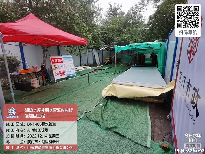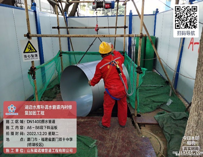 4.项目概况:湖边水库DN1400补调水管道全长8709.5m,起点为高殿水厂。湖边水库补调水管道设计输水能力20万m³/d,是保障厦门市岛内原水应急供应的重要管道。湖边水库补调水管道补调水管道自2010年1月投入运行,部分路段管道多次发生漏水或破管事件,因此本次对爆管频繁发生段管道予以修复。该现状管管径为DN1400,采用预应力II 级钢筋混凝土管(以下简称混凝土管)、钢管和球墨铸铁管埋地铺设,其中原管材为钢管或球墨铸铁的管段本次不予以修复。由于混凝土管段多次发生管道破裂、脱节及沉降事件,因此本次对混凝土管段予以修复,全长3568.55m。采用非开挖方式内衬不锈钢更新修复。