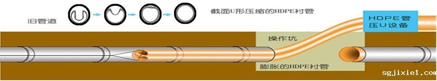 18lukc新利是将外径等于或略小于待修复管道内径的HDPE衬管,通过专用压U设备,截面被压变成双层U形。在牵引力的作用下穿入待修复管道内部。穿插到位后,利用压力打开管腔,使之恢复成圆形,与外管道内壁贴合,形成牢靠的复合管。